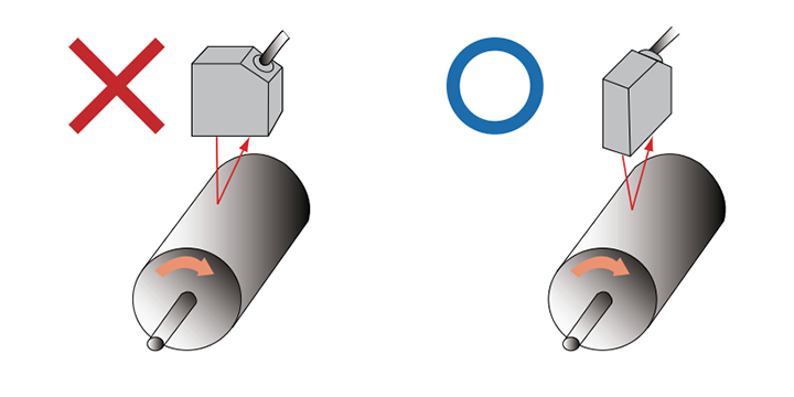 測量旋轉(zhuǎn)物體時(shí),請將傳感器的投光光軸和受光光軸構(gòu)成的平面平行于旋轉(zhuǎn)物體的旋轉(zhuǎn)軸,這樣可以最大程度的抑制旋轉(zhuǎn)物體上下晃動(dòng)或位置偏移所帶來的影響。