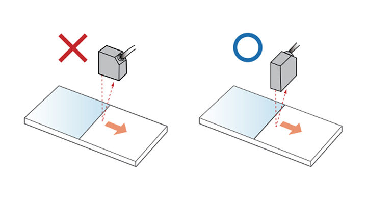 被檢物的材質(zhì)‘顏色存在明顯差異的情況時(shí),請將激光位移的投光光軸和受光光軸構(gòu)成的平面平行于被測物材質(zhì)(或顏色)差異分界線,這樣可以減少測量的精度誤差。