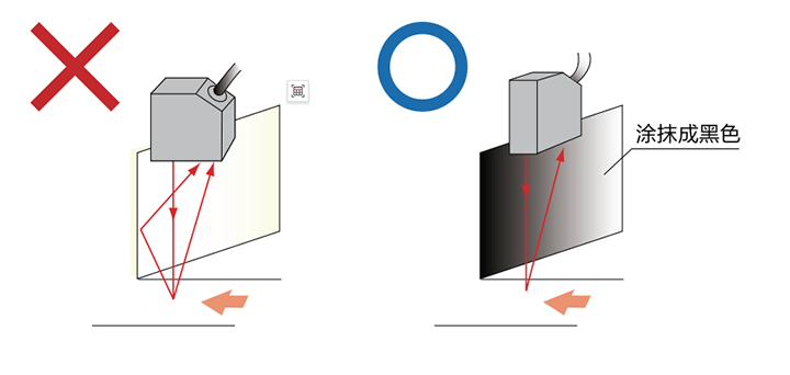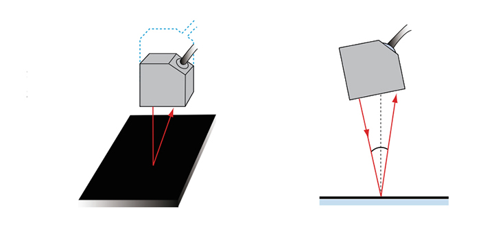 被測物為黑色物體時(shí),反射光量較少,使得受光素子的受光量較少,導(dǎo)致分辨率下降。可以通過縮短檢測距離,讓有效測量范圍內(nèi)盡可能的縮短傳感器的檢測距離,確保受光素子接收到足夠的受光量。也可以【正反射】方式傾斜安裝,時(shí)激光的入射角等于反射角,這樣提高受光素子接收的受光量。