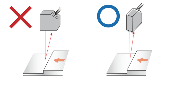被測物的表面存在段差的情況時(shí),請將傳感器的投光光軸和受光光軸構(gòu)成的平面平行于段差的邊緣區(qū)域?qū)y量的影響。