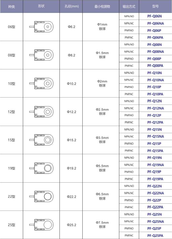 ECOTTER環(huán)型接近開關(guān)有多種規(guī)格可選,孔徑分別有6.2、8.2、10.2、12.2、15.2、19.2、22.2、25.2mm直徑,NPN\PNP開關(guān)量信號(hào)可選。