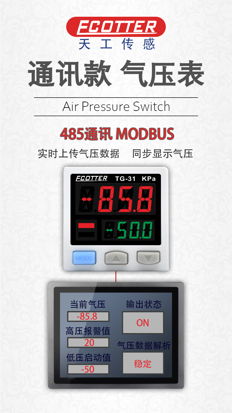 通過壓力表可以設(shè)置壓力表的地址、波特率,長按設(shè)置鍵進(jìn)入菜單設(shè)置。壓力表的通訊功能上傳氣壓數(shù)據(jù),連接觸摸屏等實(shí)現(xiàn)智能化操作。