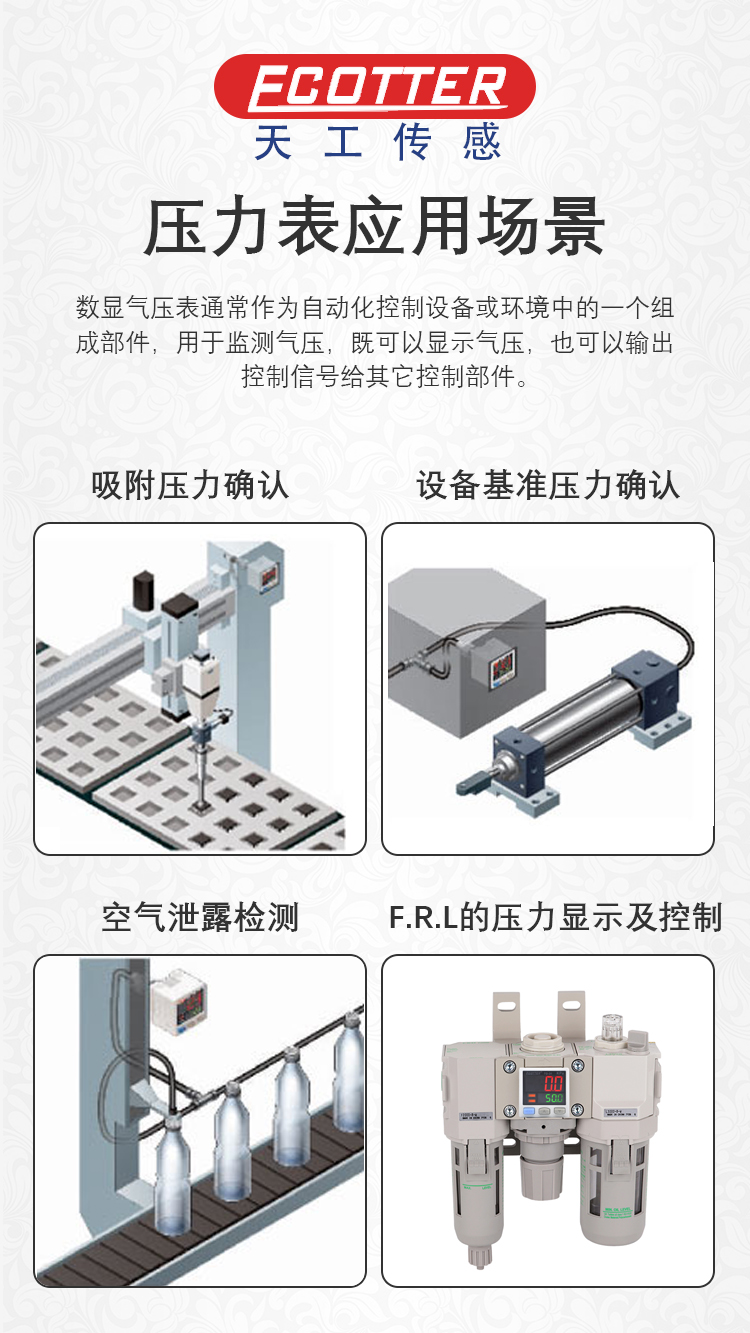 ECOTTER數(shù)顯壓力表監(jiān)測氣壓之余,可以根據(jù)設(shè)定值輸出信號,如在吸附確認(rèn)的應(yīng)用中,吸到物料和沒吸到物料的時候會有明顯的區(qū)別,氣壓表就可以設(shè)置在不同的氣壓輸出信號。
