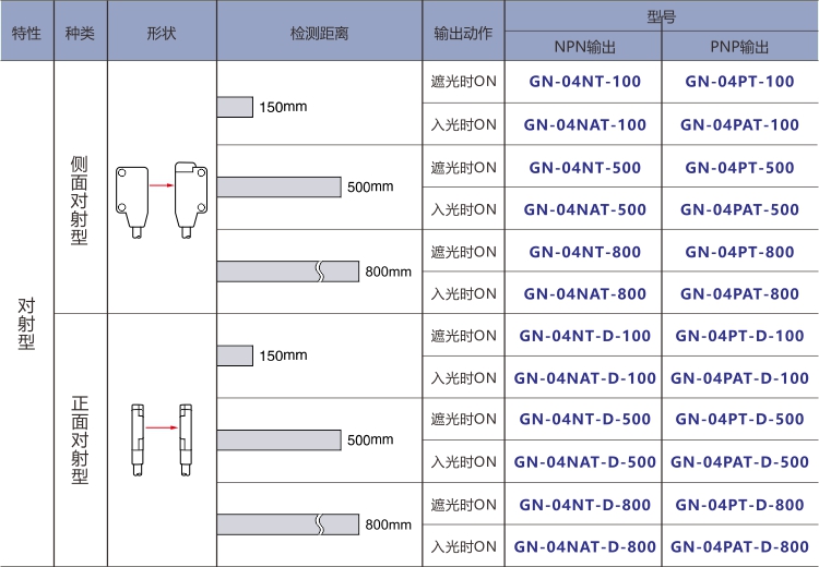 ECOTTER 超薄對射光電開關 GN-04T系列 有正面對射和側(cè)面對射款,安裝距離(檢測距離)可選100mm\500mm\800mm,可根據(jù)應用情況選擇。