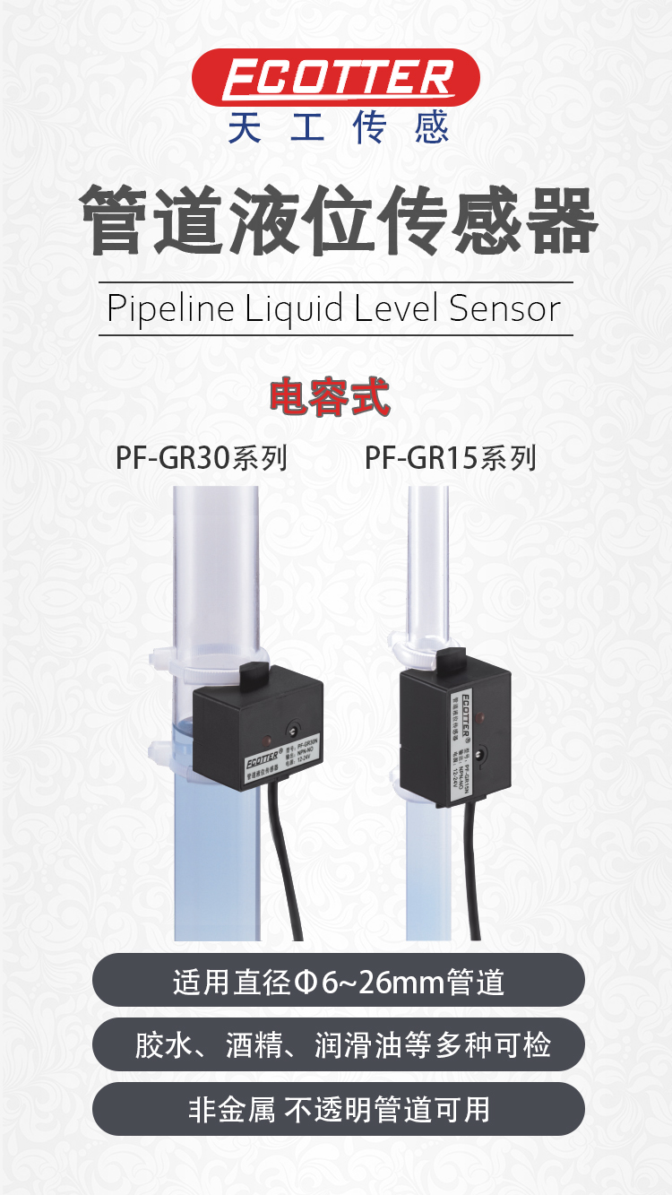 ECOTTER 電容式管道液位傳感器 PF-GR系列 由天工傳感 自主研發(fā),根據(jù)靜電容原理設(shè)計,所以它可以檢測非透明管道里面的液體情況,如橡膠管、鐵氟龍管、PVC管、陶瓷管等。