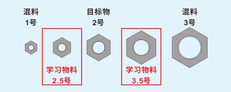 目標物通過傳感器檢測區(qū)域時會以各種姿勢進行,所以我們?yōu)榱吮苊饴z,經(jīng)常會選擇比原目標物稍大和稍小的物料進行學習。