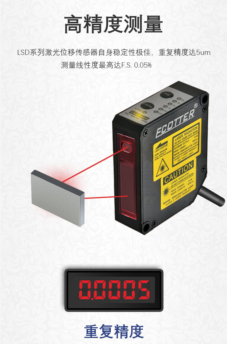 ECOTTER 激光位移傳感器有LSD-30系列量程25~35mm款,重復(fù)精度0.5um,測(cè)量精度5um;LSD-50系列量程40~60mm款,重復(fù)精度3um,測(cè)量精度20um;LSD-85系列量程65~105mm款,重復(fù)精度5um,測(cè)量精度50um;LSD-250系列量程100~400mm款,重復(fù)精度20um,測(cè)量精度500um。