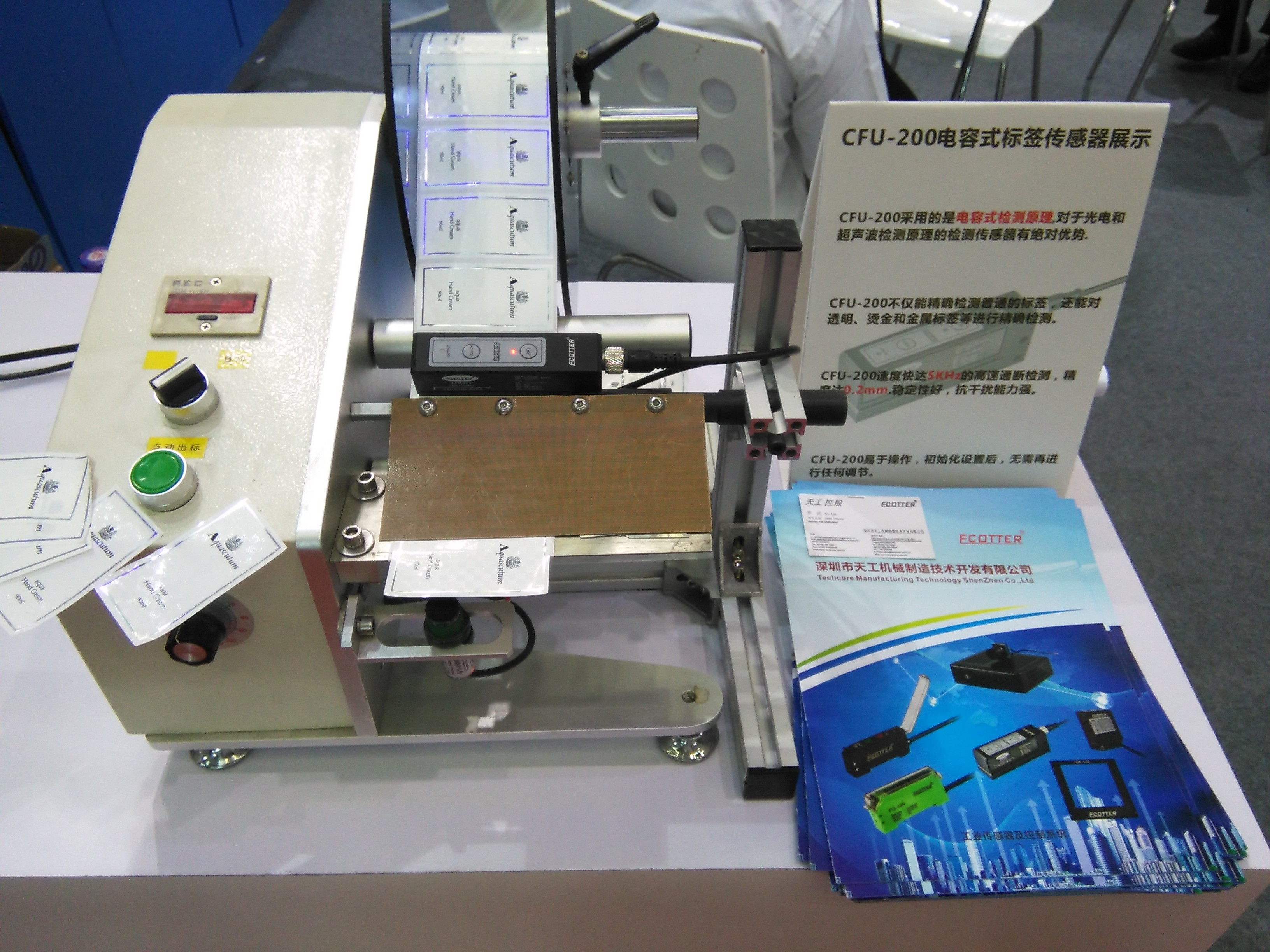 CFU-200標(biāo)簽傳感器展示,本次展會(huì)我司選擇的檢測(cè)的標(biāo)簽是一種燙金標(biāo)簽(一般的傳感器對(duì)其無(wú)法準(zhǔn)確檢測(cè))但是我們的CFU-200向客戶展示了它的精確性和穩(wěn)定性等。
